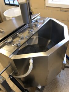 100 gallon MicroDairy Vat Pasteurizer (2016). Click HERE for description and additional photos. 42″ tall x 49″ wide. PMO certified. Jacketed, heavy stainless steel construction, hexagonal shape on a frame with casters. Basic hose connection to fill the jacket, plus 3 heating elements work quickly to get to pasteurization temp. Hydraulic tilt tips the vat for washing (no drain valve). Airspace heater needs maintenance, otherwise in great shape. Includes pasteurizer control unit, lids and airspace heater and thermometers. $9,500.